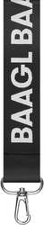 Čierny textilný prívesok na kľúče s karabínkou.|