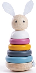 Farebné a krásne nasadzovacie kruhy zo 100% FSC® dreva nadchnú všetky zvedavé deti. Roztomilý dizajn so zajačikom v pastelových farbách bude pomocníkom pri rozvoji zručnosti a rozpoznávania farieb. Zajačik má plstené ušká a chvost, deti sa vďaka tomuto detailu naučia o rozdielnych textúrach, je to teda tiež hmatová hračka.