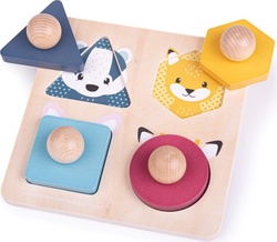 Táto drevená skladačka pomáha malým deťom rozvíjať zmysel pre tvary, farby a rozpoznávať zvieratá, pretože tvar priraďujú k správnym otvorom na základnej doske. Akonáhle sú všetky dieliky skladačiek vložené, vytvorí sa živý obrázok so zvieratkami. Skladačka je vhodná pre malé ručičky, pretože môžu pomocou veľkých drevených úchytov zdvihnúť tvary a odhaliť zvieratko pod nimi. Skvelý spôsob, ako rozvíjať jemné motorické zručnosti a zručnosť malých detí pri zdvihnutí, uchopení a skúmaní každého dielika skladačky.