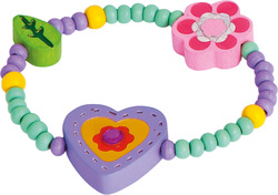 Farebný náramok z drevených korálikov sa pýši veľkým fialovým srdiečkom s kvietkom, zeleným lístočkom a ružovým kvietkom.