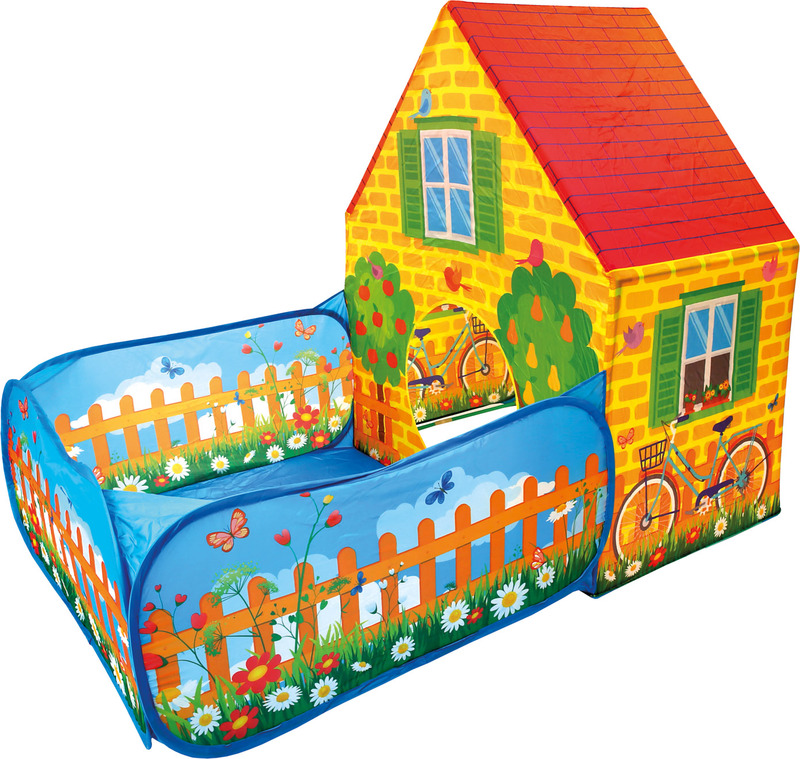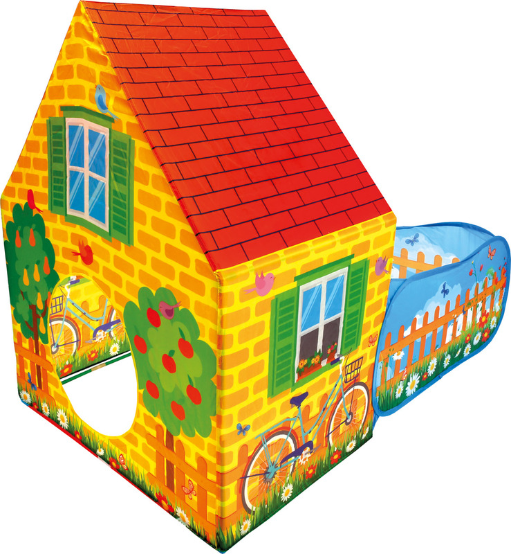 Detský stan "dom s predzáhradkou". Detský stan vyrobený z materiálu PES na vnútorné aj vonkajšie použitie, ktorý ponúka najmenším zábavu a zároveň môže byť veľmi rýchlo postavený a uložený tak, aby sa šetril priestor.