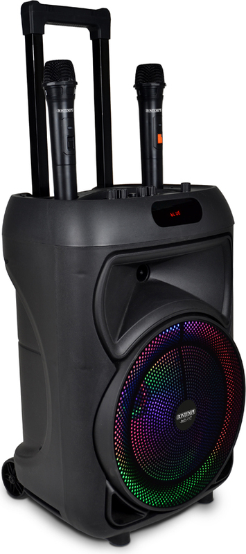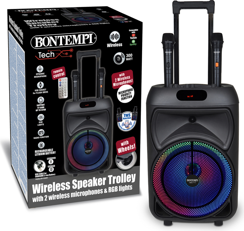 Bezdrôtový vozíkový reproduktor s 2 bezdrôtovými mikrofónmi a RGB svetlami