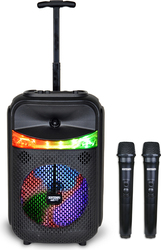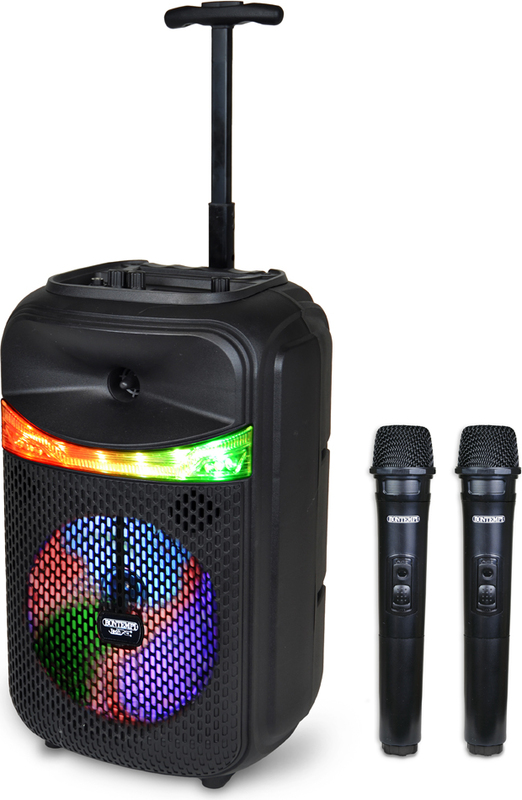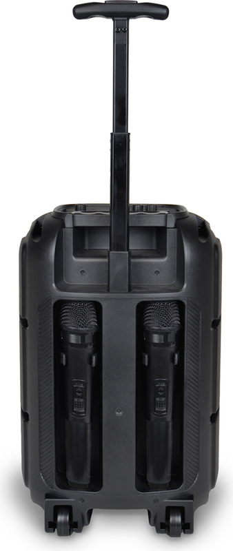 Kufrík na kolieskach s 2 bezdrôtovými mikrofónmi a RGB svetlami pre kompletný a dynamický zvukový zážitok.