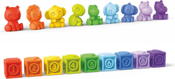 - 9 stohovateľných kociek a 9 zvieratiek – pomocou ktorých sa dieťatko učí čísla, farby a jemnú motoriku