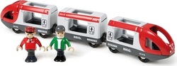 Moderný osobný vlak v červeno-bielej farbe. Súčasťou sú dva panáčikovia. Táto súprava kompatibilná so všetkými drevenými železničnými dráhami na trhu.