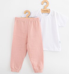 Súpravička sa skladá z bavlneného trička s krátkym rukávom a mušelínových nohavíc. Veľmi praktický set pre deti aj do škôlky. Bavlnené tričko je veľmi pohodlné už len tým, že je vyrobené z kvalitnej bavlny, bez zapínania, s jemným lemom okolo krčku. Lem nesmie tlačiť, obopínať a tričko sa musí ľahko obliekať cez hlavičku. Mušelínové detské jednofarebné nohavice s moderným dizajnom sú ušité z kvalitného mušelínu.