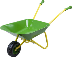 Záhradný fúrik v zelenej farbe pre malých záhradníkov má stabilné koliesko, kovovú misku a plastové rukoväte ..