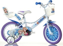 Detský bicykel DINO Bikes - 16" s motívom Snow Queen so sedačkou pre bábiku a košíkom, pre najmenších cyklistov. Kvalitné, vzduchom plnené pneumatiky s kovovými ráfikmi, dve čeľusťové brzdy a voľnobežný prevod. Odporúčaný vek a výška dieťaťa: 4-6 rokov, 107 -138 cm.