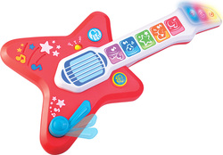 Nechajte uniesť kúzlom zvuku a hrajte na gitaru ako skutočná rocková hviezda! Hračka k ilúzii pripomína plnohodnotný hudobný nástroj. Nájdeme tu hmatník s dotykovými tlačidlami a šachtu, ktorá pretaktuje zvuk a posúva hru do úplne inej dimenzie! K výberu máme 2 herné režimy a ovládanie hlasitosti, vďaka čomu hračku prispôsobíme individuálnym potrebám malého gitaristu. Hru na nástroj sprevádzajú blikajúce svetlá. Hračka je určená pre deti od 18 mesiacov.