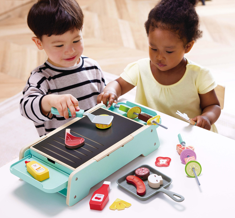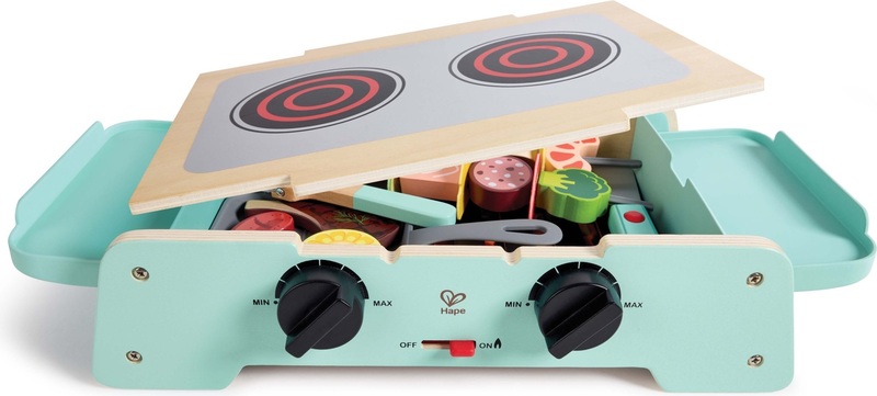 Hlavnú varnú plochu je možné otočiť a vytvoriť tak varnú dosku. Chlapci aj dievčatá objavia radosť z grilovania alebo varenia na panvici s touto drevenou hračkou na hranie rolí, ktorá vydáva syčiace zvuky, žeravé uhlíky a rôzne interaktívne kuchynské príslušenstvo.