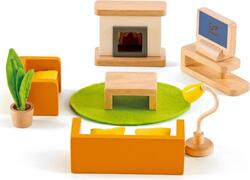 Drevený nábytok a doplnky do obývačky v domčeku pre bábiky obsahuje pohovku, kreslo, stolík, televízor, lampu, krb, koberec a kvet. Podporuje fantáziu a rolové hry.Rozmery: 7,9 × 3,9 × 10,2 cm