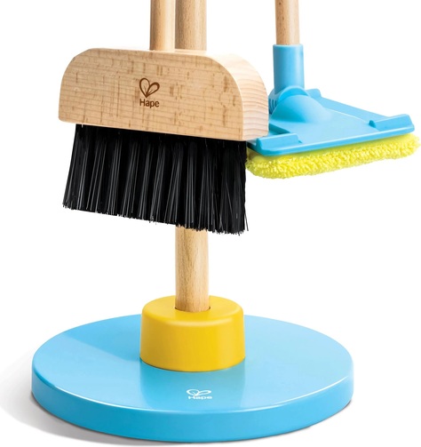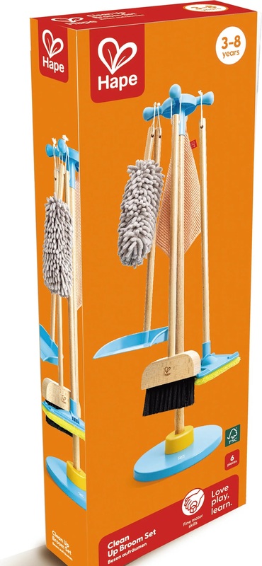 Hape Clean-Up Broom Set Súprava upratovacích hračiek: metla, mop, lopatka, handrička a stojan. Učí poriadku a zodpovednosti cez hru.