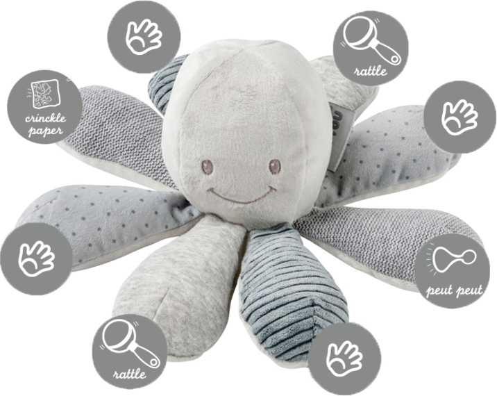 - špeciálny materiál dokáže nasať prirodzenú vôňu matky, vďaka čomu sa bábätko cíti bezpečne Chobotnička teda sprevádza Vaše bábätko už od jeho prvých chvíľ, a bude jeho skutočným priateľom, ktorý ho upokojí, dodá mu pocit bezpečia a komfortu.