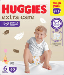 Prémiové jednorazové plienkové nohavičky HUGGIES® EXTRA CARE sú najjemnejšie a najmäkšie plienky pod značkou HUGGIES®. Mäkké vankúšiky, ktoré prichádzajú do bezprostredného kontaktu s detskou pokožkou vytvárajú jemnú bariéru medzi pokožkou a tekutou stolicou.