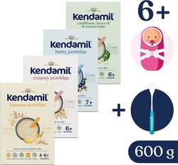 Zloženie Kendamil Mliečna kaša s brokolicou, karfiolom a paradajkami (150 g): obilniny (64%) (hydrolyzovaná ryžová múka, kukuričná múka), sušené odstredené MLIEKO (26%), zeleninové vločky (4%) (karfiol, paradajky, brokolica, cibuľa, špenát), rastlinný repkový olej, prírodné arómy, minerálne látky (uhličitan vápenatý, pyrofosfát železa, síran zinočnatý), výťažok z kvasníc, vitamíny (vitamín A, vitamín D3, vitamín E, vitamín C, tiamín (vitamín B1), vitamín B2, vitamín B6, niacín, kyselina listová, kyselina pantoténová, biotín). Vyrobené z 18 g paradajok, 6 g karfiolu, 4 g brokolice, 3 g cibule a 2 g špenátu. Alergény sú v zložení uvedené VEĽKÝMI PÍSMENAMI. BEZ GLUTÉNU. Zloženie sa vzťahuje na sušený stav potraviny. Balenie obsahuje cca 7 porcií. Výživové údaje Kendamil Mliečnej krémovej ovsenej kaše (150 g): [údaje v hranatých zátvorkách označujú hodnoty na jednu porciu (20 g + 60 ml vody)]: Energia 1709 kJ / 405 kcal [342 kj / 81 kcal]; tuky 8,6 g [1,7 g], z toho nasýtené mastné kyseliny 1,1 g [0,2]; sacharidy 64 g [13 g], z toho cukry 31 g [6,2 g]; vláknina 3,8 g [0,8 g]; bielkoviny 16 g [3,2 g]; soľ 0,3 g [0,06 g]; vitamín A 360 µg [72 µg] (19 %*); vitamín D3 6,5 µg [1,3 µg]; vitamín E 6,0 mg [1,2 mg]; Tiamín B1 0,9 mg [0,18 mg] (36 %*); riboflavín (B2) 1,0 mg [0,2 mg] (25 %*); vitamín B6 0,65 mg [0,13 mg (19 %*); biotín 15 µg [3 µg]; niacín 4,6 mg [0,9 mg]; kyselina listová 45 µg [9 µg]; kyselina pantoténová 2,6 mg [0,52mg]; vitamín C 60 mg [12 mg]; sodík 0,12 g [0,02 g]; vápnik 460 mg [92 mg] (23 %*); železo 7,5 mg [1,5 mg] (25 %*); zinok 4,5 mg [0,9 mg] (23 %*). Poznámka: * % RHP – referenčná hodnota príjmu na jednu porciu.