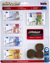 Euro bankovky, mince a platobná karta, balené na blistri. Materiál papier a plast.