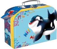 Papierový školský kufrík, šírka 25 cm, kovová rukoväť a zámok|