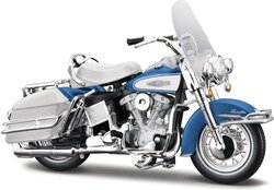 Motocykel Harley-Davidson 1966 FLH Electra Glide, séria 44.Model v mierke 1:18 má veľmi dokonalé, detailné prevedenie jednotlivých častí a kvalitné farebné prevedenie. Kovový model s plastovými doplnkami. Model má riaditeľnú vidlicu, pohyblivý bočný stojan a približnú dĺžku 8“. Balené v blister boxe.