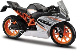 KTM RC 390. Kovové modely motocyklov v modelovom meradle 1:18. Motocykle majú otáčavé riadidlá a odpruženú zadnú nápravu. Sú usadené na čiernom plastovom podstavci.