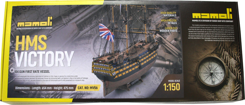 Stavebnica neplávajúceho modelu MAMOLI HMS Victory v mierke 1:150 z roku 1765. Stala sa slávnou, keď sa 21. októbra 1805 zúčastnila ako vlajková loď admirála Nelsona v bitke pri Trafalgare, v ktorej Angličania porazili francúzsko-španielsku. Dĺžka 564mm, výška 475mm Dnes je pyšná loď plne obnovená, sedí na suchom doku a slúži ako pamätník na britskú námornú pýchu. V balení sú drevené diely, lišty a množstvo kovania, príslušenstvo, veľké stavebné plány v mierke 1: 1 a mnoho perspektívnych výkresov uľahčujú montáž. Určené pre skúsených modelárov.