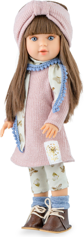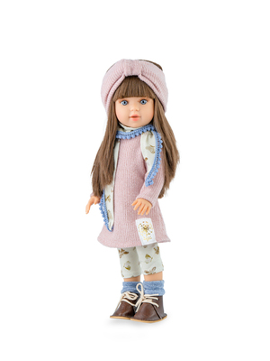 Má na sebe legíny s pletenými šatami a šálom, ponožky, čelenku a zladené papučky. Telo je celé z vinylového plastu.