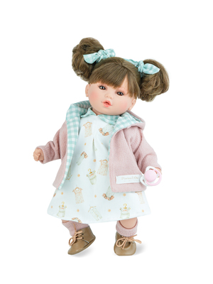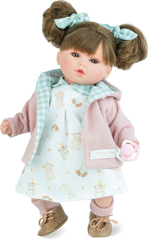 Bábika Petite Pique je 40 cm bábika, úplne vyrobená v Španielsku z vysokokvalitných materiálov. Oblečená v pekných šatách s copíkmi, svetríkom a topánočkami. Má mäkké telíčko a krásne vonia. Odporúčané pre deti od 3 rokov.
