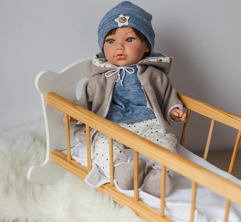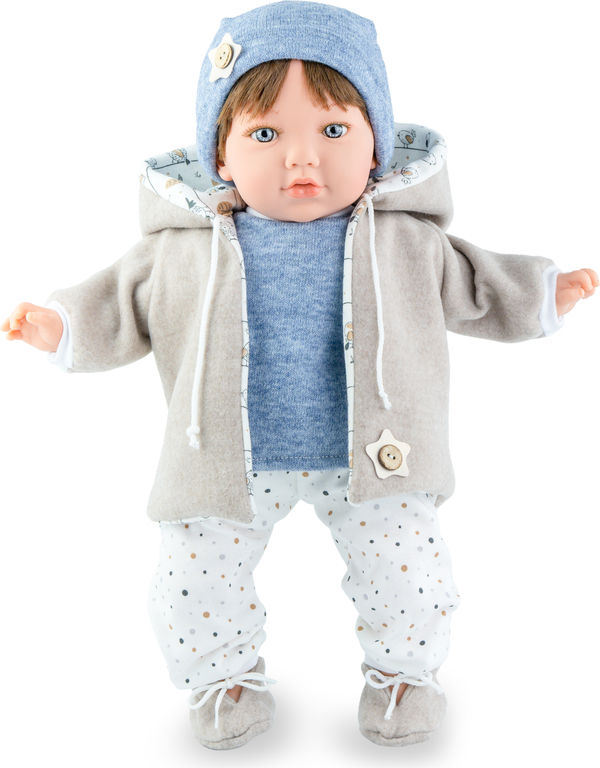 Bábika Teo Winter je 45 cm bábika, úplne vyrobená v Španielsku z vysokokvalitných materiálov. Má na sebe nohavice, tričko, mikinu s kapucňou, topánky a zladenú čiapku. Má mäkké telo a krásne vonia. Dodáva sa v škatuľke. Odporúčané pre deti od 3 rokov.