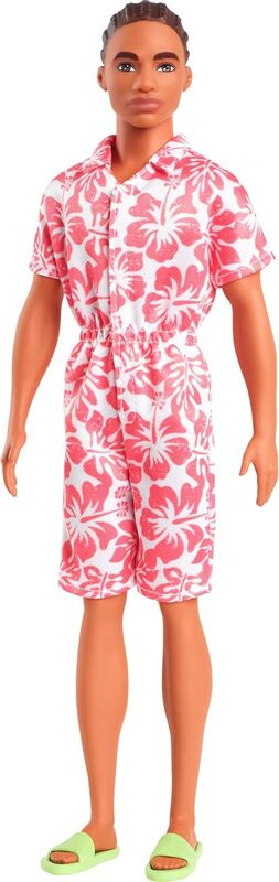 Táto bábika Ken má na seba bielo-koralový overal s potlačou v havajskom štýle.
