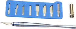 Profesionálny modelársky nôž s deviatimi rôzne tvarovanými čepeľami, dlhou rukoväťou a bezpečnostnou hliníkovou krytkou.
