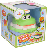 Modelína žaba. Veľkosť 15cm. Žaba funguje ako formička, otvára sa v dvoch vrstvách. V jednej vrstve sú formičky v tvare zvieratiek, druhá vrstva tvaruje suroviny na výrobu hamburgera.