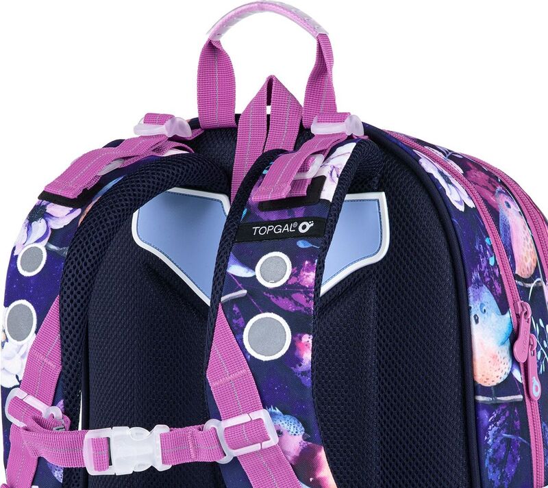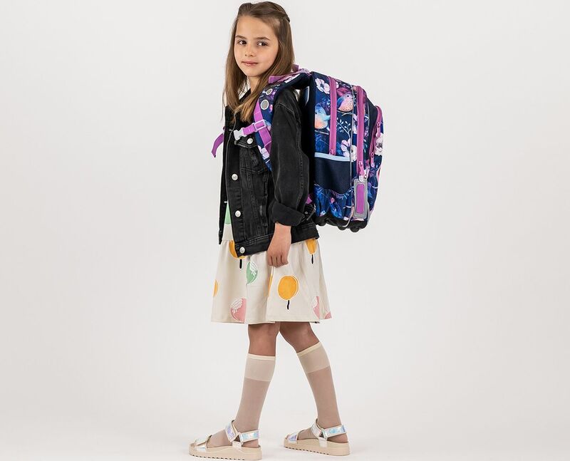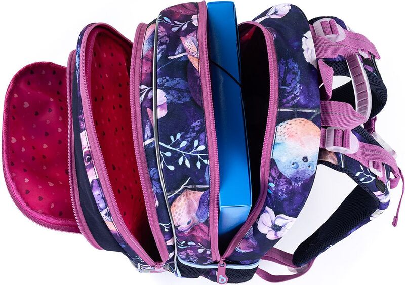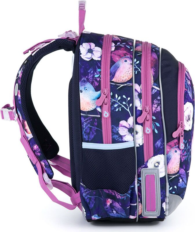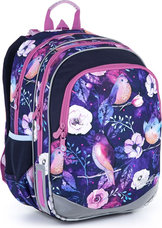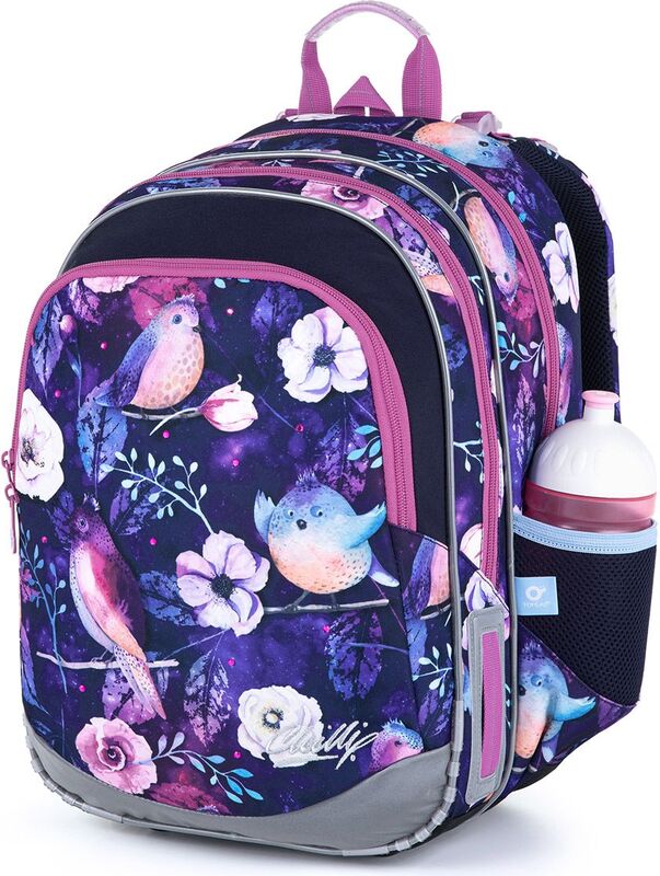 Ľahučká dvojkomorová taška pre dievčatá na prvom stupni s motívom vtáčikov, kvietkov a s fialovými trblietkami. To je parádná kombinácia pre školáčky na prvom stupni ZŠ. Navyše neváži ani kilogram a zhĺtne veľa nákladu!