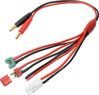 Nabíjací kábel s banánmi 4 mm a paralelne zapojenými konektormi - Tamyia, Deans, MPX (prístroj) a pár voľných káblov. Kábel má prierez 16AWG.