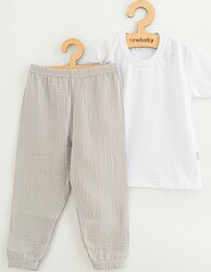 Štýlová a praktická 2-dielna detská súprava New Baby Kindergarten. Súpravička sa skladá z bavlneného trička s krátkym rukávom a mušelínových nohavíc. Veľmi praktický set pre deti aj do škôlky. Bavlnené tričko je veľmi pohodlné už len tým, že je vyrobené z kvalitnej bavlny, bez zapínania, s jemným lemom okolo krčku. Lem nesmie tlačiť, obopínať a tričko sa musí ľahko obliekať cez hlavičku. Mušelínové detské jednofarebné nohavice s moderným dizajnom sú ušité z kvalitného mušelínu. Pre veľmi ľahké obliekanie majú praktický voľný strih, v páse a na nohavičkách je gumička, ktorá netlačí. Nohavice sú veľmi vhodné aj na bežné detské činnosti. Zloženie: 100% bavlna. OEKO-TEX STANDARD 100. Mušelín je jedna z najčistejších, najjednoduchších a najjemnejších tkanín na svete. Je to tkaný priedušný materiál, ktorý si zamilovali deti aj rodičia po celom svete. Mušelín je veľmi odolný a to tak, že bez problémov zvláda opakované pranie. Rozmerová tabuľka-posledná foto.