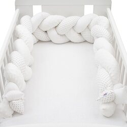 Hebučký a praktický pletený vrkoč New Baby je modernou alternatívou tradičného alebo vankúšového mantinelu nielen do detskej postieľky. Všetky tri pramene sú vyrobené z veľmi kvalitného bavlneného materiálu a antialergickej polyesterovej výplne a ručne spletených do vrkoča. Môžete ho použiť v postieľke, kolíske, kde chráni dieťa pred tvrdými priečkami postieľky a izoluje od studenej steny. Mantinel sa prispôsobí každej postieľke a pomocou troch priložených stúh ho ľahko upevníte. Staršie dieťa ho môže využívať pre zábavu alebo ako originálnu dekoráciu detskej izby.