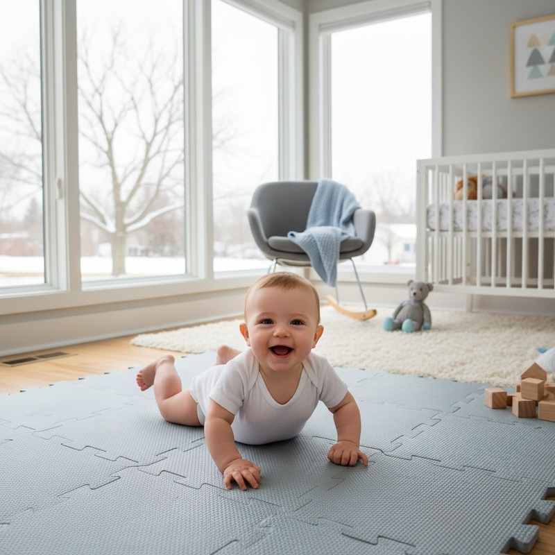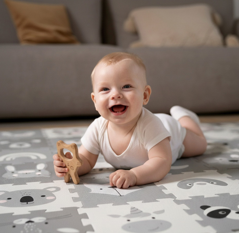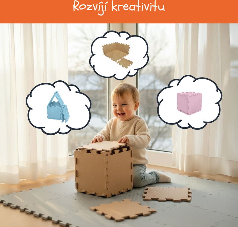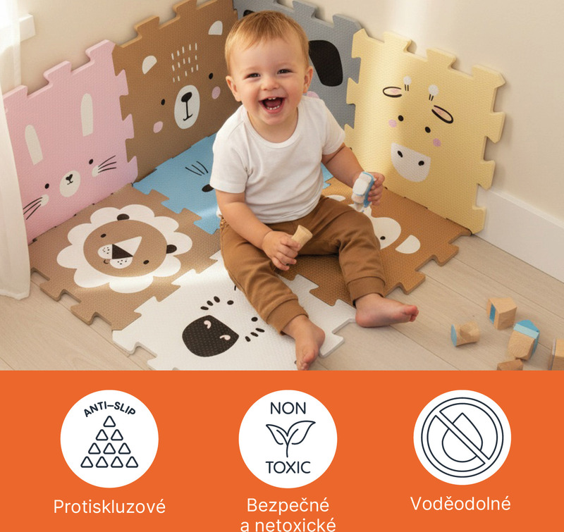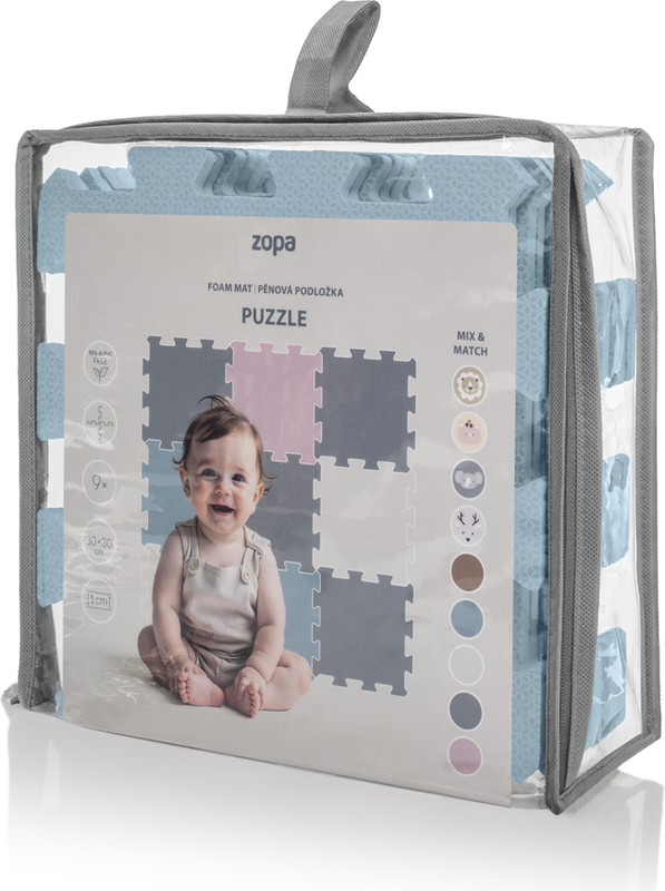 Jednotlivé dlaždice 30 × 30 cm (9 ks) do seba perfektne zapadajú. Podložka je vhodná pre deti od narodenia, vyrobená z nezávadného a príjemného materiálu.