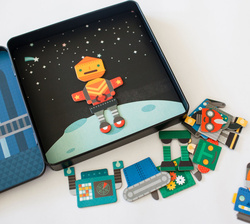 Pripnite magentov na tabuľku a vytvárajte rôzne postavičky robotov! Balenie obsahuje cez 25 magnetických dielikov, s ktorými sa deti dokážu vyhrať. Zabalené v plechovej krabičke, ktorá sa dá pevne zavrieť, perfektná hračka na cesty. Plechová krabička má vo vnútri, na stenách, dve scenérie.