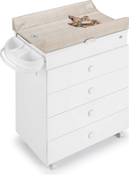 Prebaľovací stôl Asia Bianco od značky Cam ponúka ideálne riešenie pre všetkých rodičov, ktorí hľadajú spojenie praktickosti, bezpečia a elegantného dizajnu. Komfort dieťaťa zabezpečuje mäkká vyklápacia prebaľovacia podložka s bezpečnostným systémom. Stôl je vybavený vaničkou s 2 anatomickými sedadlami (jedna opierka pre bábätká od 0 do 6 mesiacov a druhá s opierkami na ruky pre deti od 6 do 12 mesiacov) a držiakmi na hubku a mydlo. Úložný priestor zahŕňa štyri priestranné zásuvky s kovovými pojazdmi, kde ľahko uložíte všetky potrebné veci. Vďaka drevenej doske možno prebaľovací stôl jednoducho premeniť na štýlovú komodu, ktorú môžete používať aj po skončení obdobia prebaľovania. Manipuláciu uľahčujú štyri kolieska, z ktorých dve sú vybavené brzdami pre zaistenie stability a bezpečnosti.• 4 kolieska, 2 s brzdami