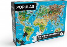 - Zemepisné puzzle pre deti s mapou sveta a ilustráciami v podobe svetových pamiatok a turistov vyhľadávaných miest.