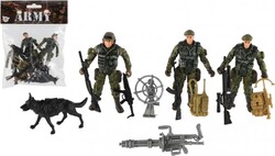 V balení sú traja vojaci a doplnky - zbrane, pes, počítač a ďalšie.