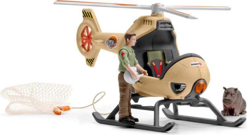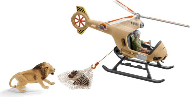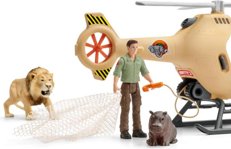 Hrošie mláďa je v nebezpečenstve. Dlhými krokmi sa už blíži lev, ale správca parku je našťastie blízko sa svojím vrtuľníkom.S novým záchranným vrtuľníkom zo Schleich® Wild Life môže správca hrošie mláďa zachrániť z hlbokej rokliny pred levom. Lanovým navijakom spustí z vrtuľníka prepravnú sieť. Mladý hroch v poslednej sekunde vylezie na sieť a správca parku levovi bleskovo uletí. Záchranná akcia sa podarila.