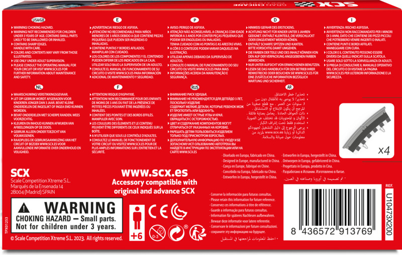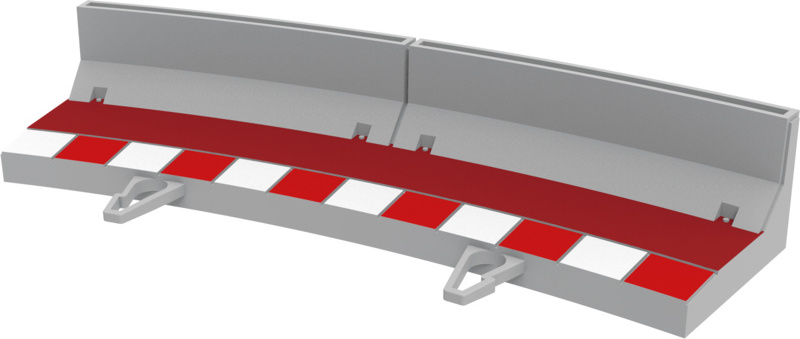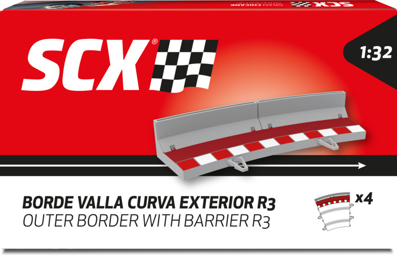 Krajince s mantinelmi pre vonkajší oblúk R3 autodráh SCX 1:32. Balenie obsahuje 4 kusy krajníc s mantinelmi.