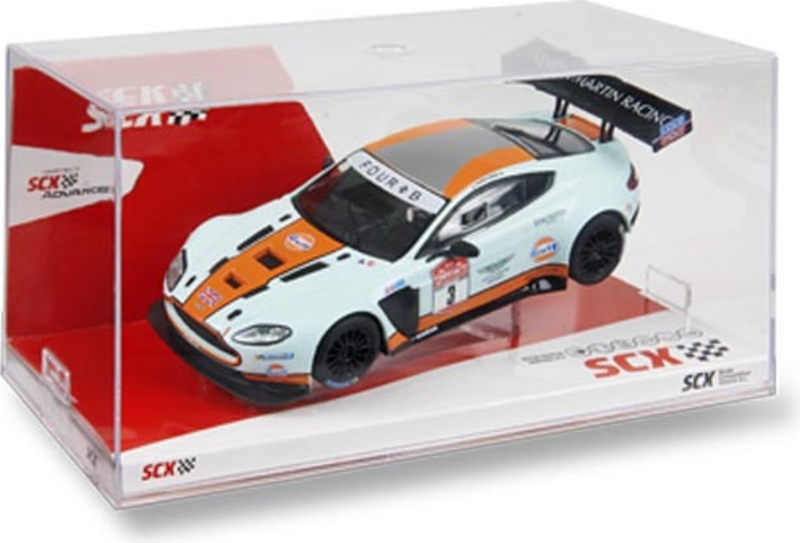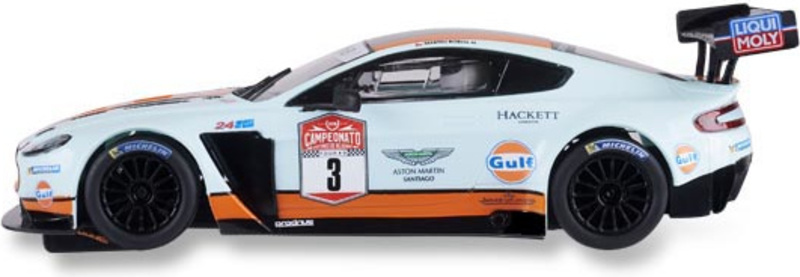 Dráhové autíčko SCX Original Aston Martin Vantage GT3 Gulf v mierke 1:32, pre analógové autodráhy SCX Original. Autíčko je vybavené LED svetlami.