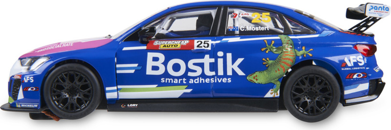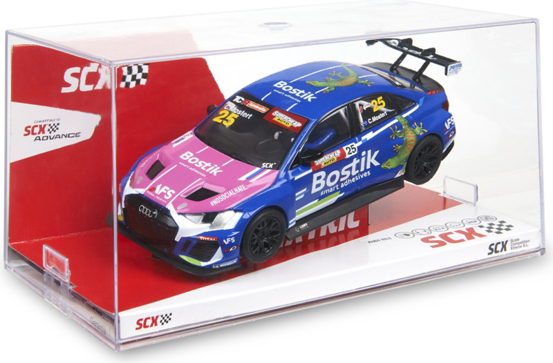 Dráhové autíčko SCX Original Audi RS3 LMS TCR Bostik v mierke 1:32, pre analógové autodráhy SCX Original. Autíčko je vybavené LED svetlami.