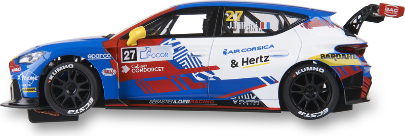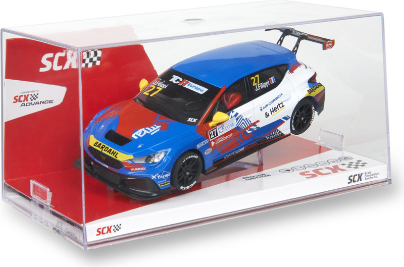 Dráhové autíčko SCX Original Cupra Leon Competition J. Filippi v mierke 1:32, pre analógové autodráhy SCX Original. Autíčko je vybavené LED svetlami.