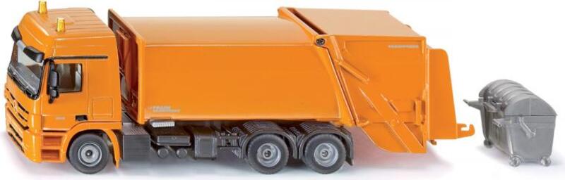 Model oranžového popelářského vozu v měřítku 1:50, vyrobený z realitě odpovídajících materiálů, kov, guma, plast. Auto je plně funkční a model je doplněn funkční popelnicí.