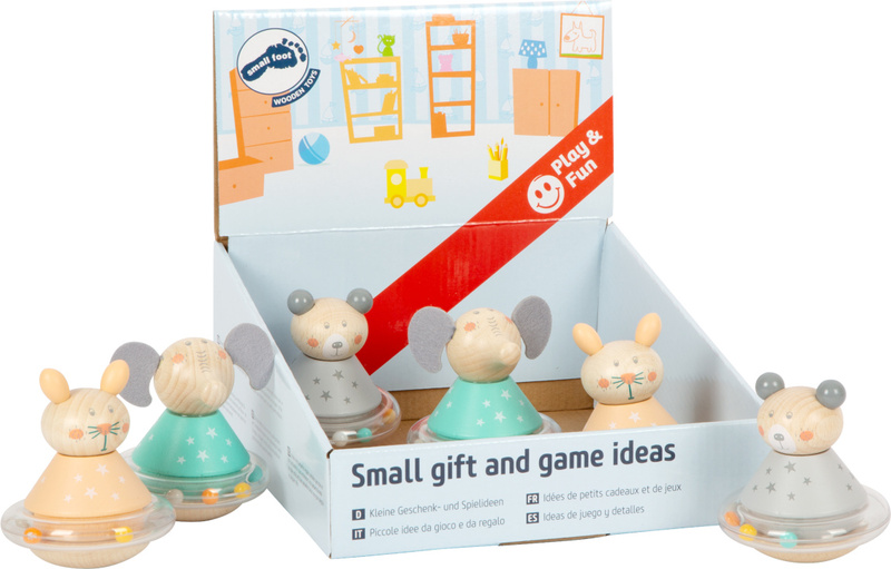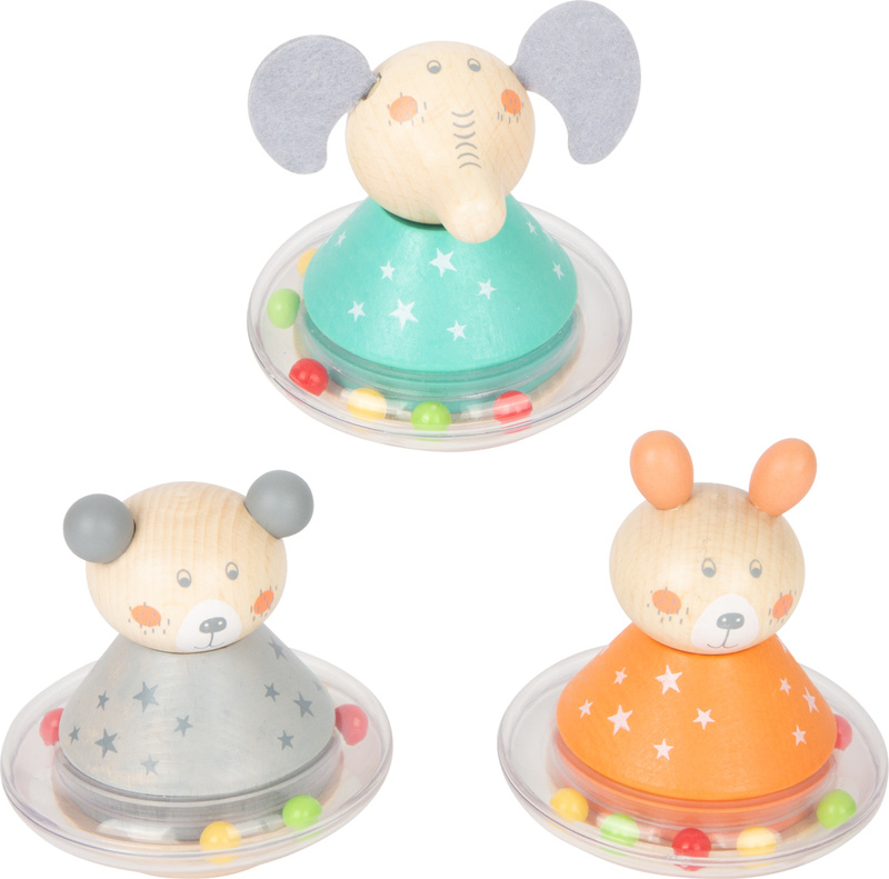 Keď do roztomilých drevených zvieratiek strčíte, začnú sa hojdať dopredu a dozadu, zároveň sa perličky okolo ich pása začnú pohybovať a vydávať pekný zvuk.