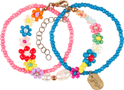 V sade sa nachádzajú tri rôzne zdobené náramky – dva jednofarebné, modrý a ružový a tretí s farebnými korálkami a kvetinovým motívom. Dva náramky sú navlečené na pružnej gumičke, ktorá sa ľahko prispôsobí detskému zápästiu a umožňuje pohodlné nasadenie bez zapínania. Tretí náramok s kvetinovým motívom má kovové nastaviteľné zapínanie. Použité materiály sú ľahké, bezpečné a neobsahujú škodlivé látky.