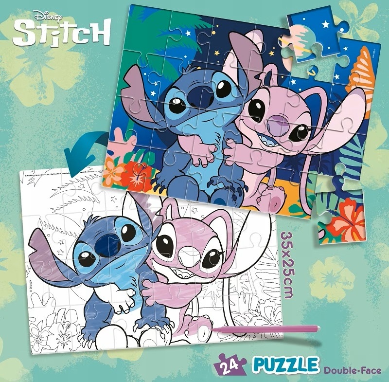 Skvelá zábava so Stitchom! Nielen krásne puzzle plné farbičiek, ale aj maľovanie. Predná strana je klasické puzzle a zadná strana je tvorená obrysmi na vymaľovanie. Takže zábava na druhú. S puzzle trénujú deti pamäť, postreh a jemnú motoriku. Puzzle obsahuje 24 dielikov.