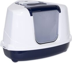 Rohová toaleta pre mačky s plastovým krytom, dvierkami, filtrom a lopatkou.