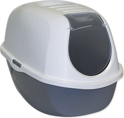 Toaleta pre mačky s plastovým krytom, dvierkami a filtrom v šedej farbe.
